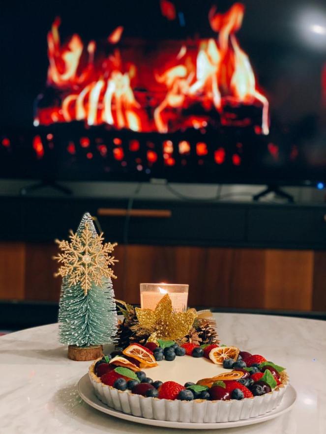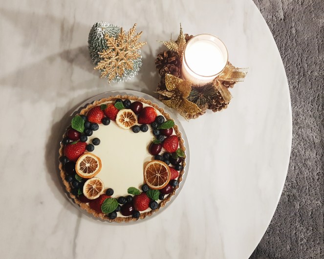 The original recipe is delicious on it’s own, but would also compliment a variety of fruits and ingredient toppings. As i had made this during the holiday season, I decorated mine with some berries, dried orange slices, dark cherries and mint leaves, with a Christmas wreath in mind. But I reckon this would also look and taste pretty fantastic with juicy mangoes or zesty citrus fruits.