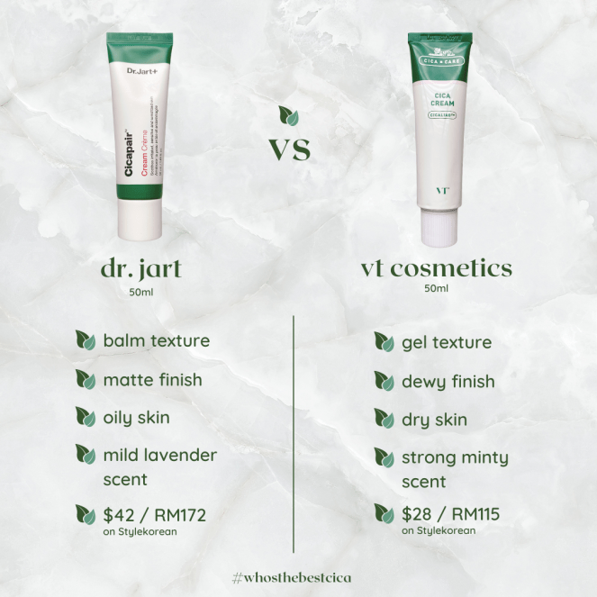 There are hundreds of cica skincare options out in the market but today, let us compare VT Cosmetic Cica Cream and Dr. Jart Cicapair Cream. Containing the well-loved Centella Asiatica ingredient, both of these share 10 similar ingredients & claims to deliver similar results, which it to calm skin’s inflammation, repair skin barrier, rich with skin healing properties & anti-bacterial properties.