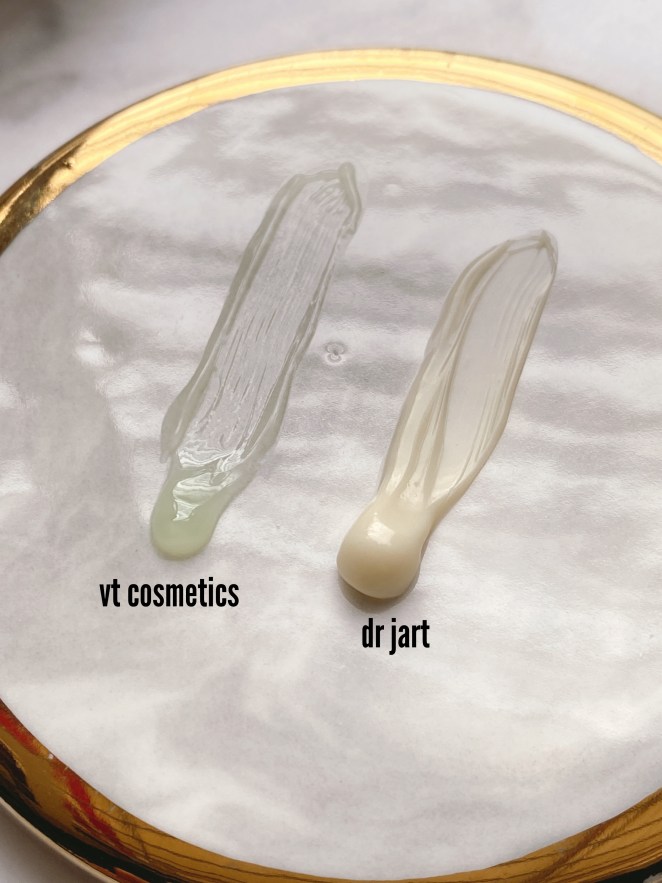 Honestly, I’d thought Dr. Jart would be better for dry skin whereas VT Cosmetics for oily skin but after religiously testing out these two, the result turns out to be quite the opposite. However, I’ve seen people saying the gel one was better for oily skin but somehow, it doesn’t provide the moisture my skin craves for as compared to Dr. Jart. The VT Cream hydrations lasts only for a lil while but Dr. Jart’s one locks in moisture well without suffocating my skin. YMMV (: