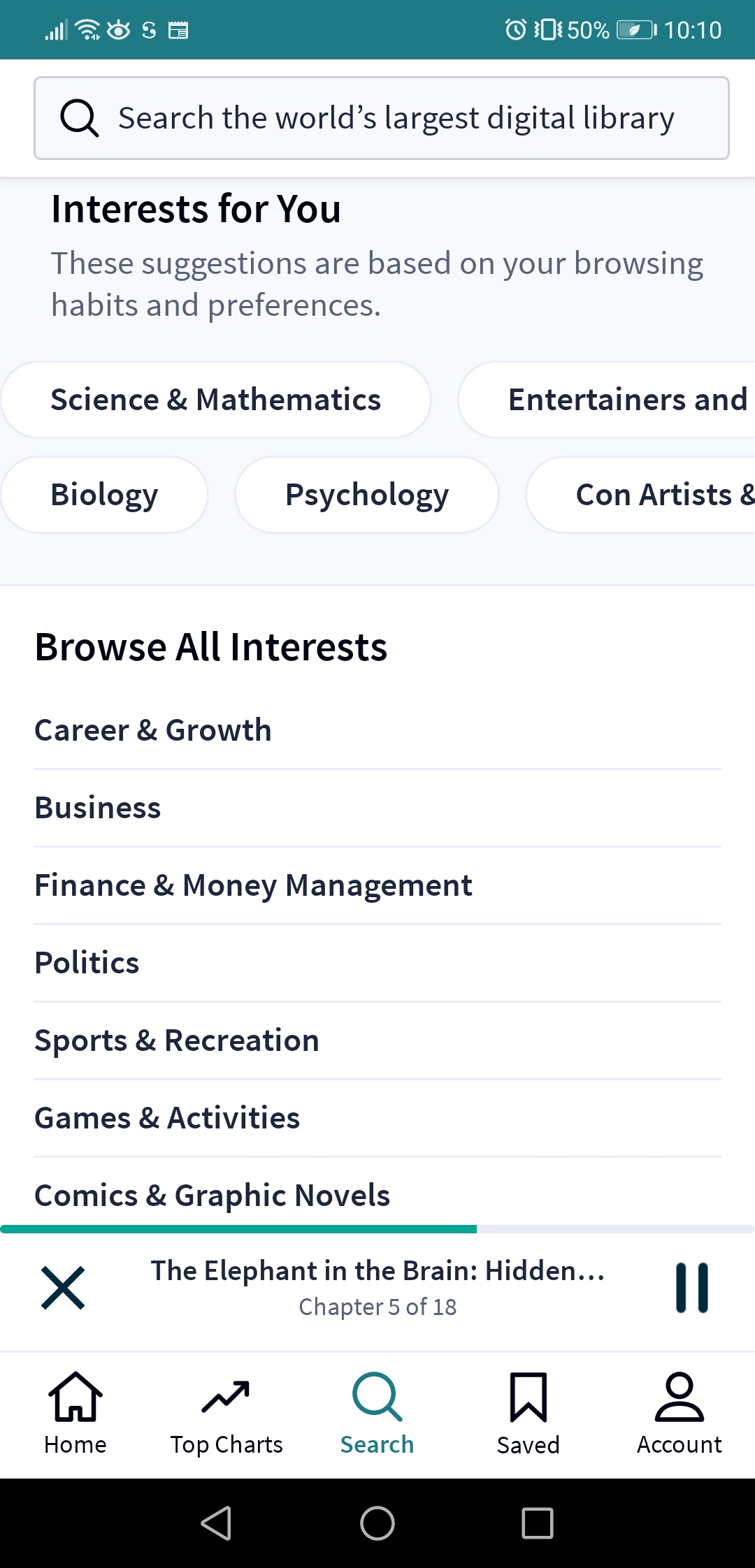 In the Search tab, you’ll see that the app is keeping track of the genres you appear interested in and they offer a really wide range of titles to choose from.