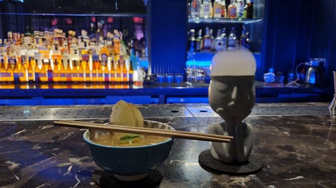 Ramen Beats : Bombay Sapphire gin, kizakura karakuchi sake, morinokura shiso umeshu plum liquer, sakura tea flower syrup, lemon juice, japanese bitters shiso and white chocolate noodles. – The element of the chocolate noodles were a good twist!