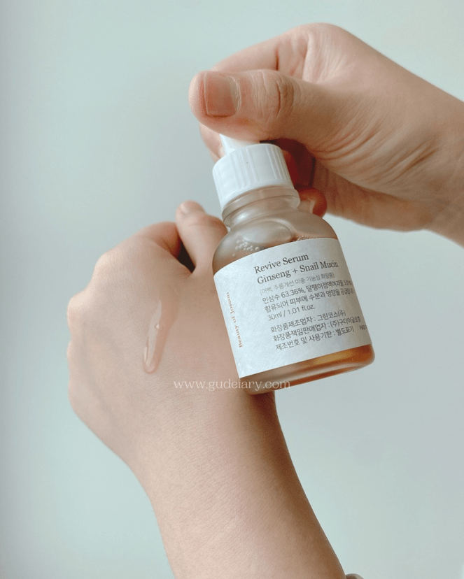 It has a warm, brown ginseng shade with just a slight goopy texture due to its snail secretion content. Has a faint herbal scent, nothing too overpowering